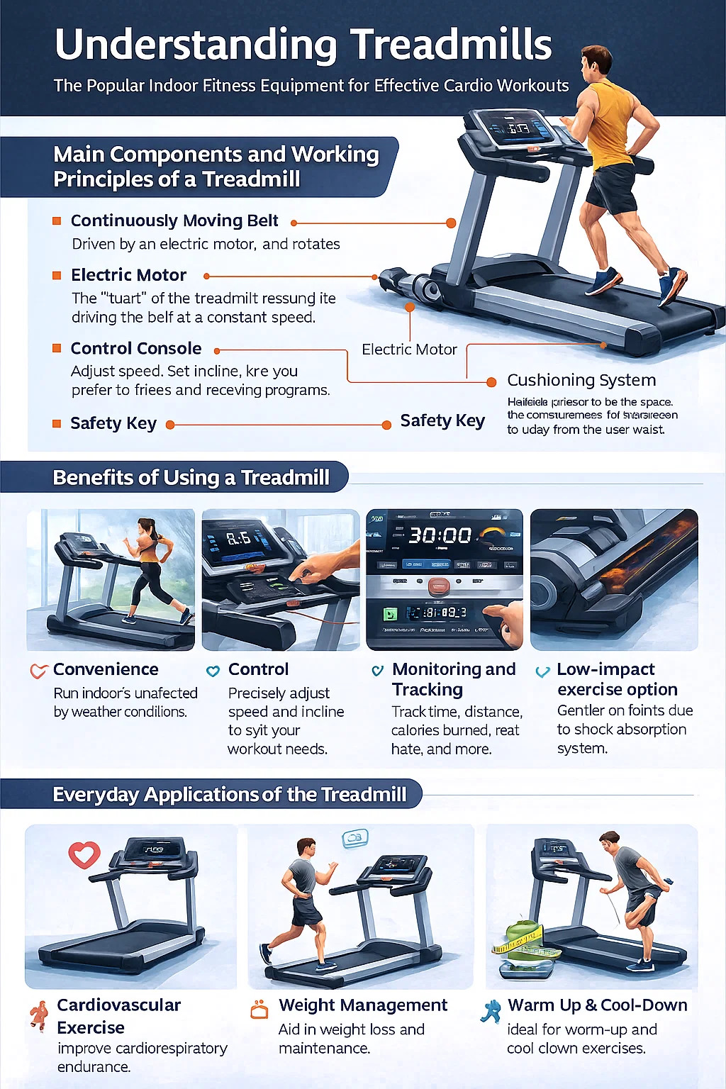 トレッドミルは通常、屋外でのランニング体験をシミュレートするために連携するいくつかの重要な部分で構成されています。
