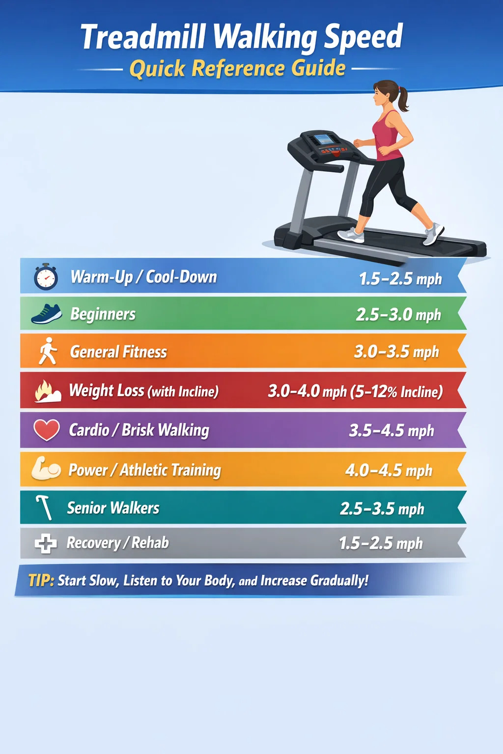 とはいえ、「適切な」速度は、年齢、フィットネスレベル、体重、そして何を達成しようとしているかによって大きく異なります。 25 歳の 5K トレーニングと、膝の怪我から回復中の 65 歳のトレーニングでは、ニーズが大きく異なります。以下のセクションでは、あらゆる状況に応じた最適なトレッドミル歩行速度を、消費カロリー、心拍数目標、実際の結果を得るためのセッションの組み立て方に関する確かなデータとともに詳しく解説します。