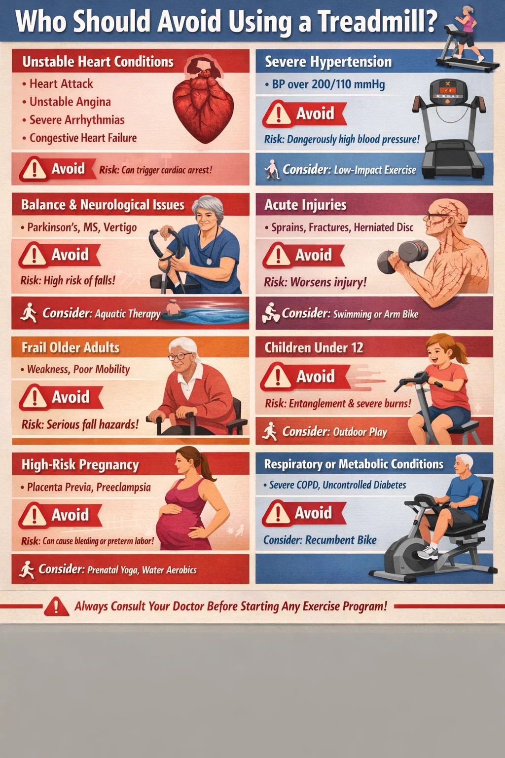 この記事では、各高リスクグループを詳細に分類し、それに関連する具体的な危険性について説明します。 トレッドミル それぞれにエクササイズを提供し、必要に応じて代替の動きのオプションを提供します。